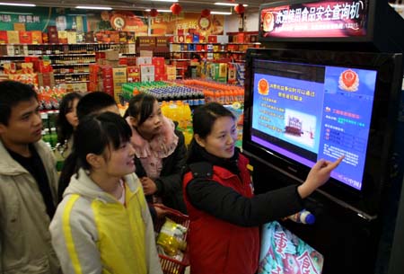 3月11日,一名超市导购员(右一)向顾客演示食品安全查询机的使用方法。 为健全食品安全体系,提高居民食品安全保障水平,山东省临沂市近日在市区大中型商场超市安装了食品安全查询机。市民只需轻扫食品包装上的条形码,即可自助查询食品质量信息,从而有效预防市民购买假冒伪劣和不合格食品的情况。