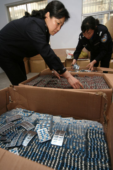 3月18日,河南省许昌市公安局魏都分局民警在涉嫌制造假药的窝点统计查获的假药、标签、药盒等。 当日,魏都警方接群众举报,在市区向阳路一闲置厂房内查获一涉嫌制造假药窝点,当场查扣涉嫌假冒药品10多种,半成品药品、包装箱、合格证、防伪标识等1000多件,涉案金额达2000余万元。据介绍,这些假药用肉眼难以分辨,必须借助先进仪器检测。此案目前正在进一步调查中。