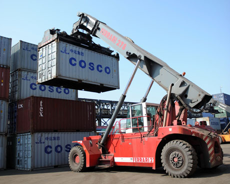 2009年第一季度,广西钦州港集装箱吞吐量完成22451标准箱,同比增长33%,其中自2月底开通钦州至香港集装箱班轮航线后,3月份共完成吞吐量10382标准箱,同比增长56%,单月货物吞吐量和集装箱吞吐量均创历史最高。图为广西钦州港勒沟作业区工人在储放集装箱。