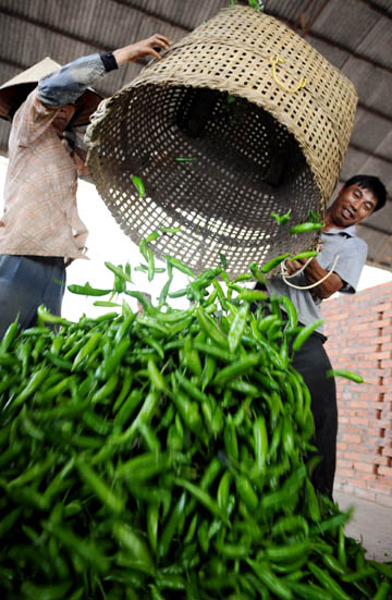 5月14日,钦州市那丽镇农民在帮助收购商储放辣椒。 2008年以来,广西钦州市农民大力发展“避雨、避寒、避晒”的“三避”技术栽培辣椒获得成功。今年种植的七万多亩辣椒,预计产量达11万吨,产值近三亿元。目前已收获的辣椒正通过各种途径销往全国各地。