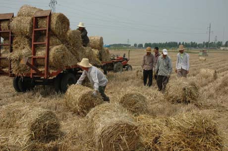 6月2日,在河南省社旗县城郊乡柳营村,秸秆打捆作业队将秸秆打捆回收。 为遏制焚烧秸秆,畜牧养殖大县社旗县组织数十台秸秆打捆机械,活跃在田间地头,将秸秆捆扎回收。秸秆可以成为牛羊饲料,变废为宝。仅此一项,每亩地可为农民增收40余元。