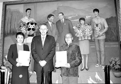 6月12日,来自中国北京桥艺术中心的画家王尊五将巨幅北京奥运会纪念性油画《奥运畅想》转交国际奥委会主席雅克·罗格,为奥林匹克博物馆的永久性藏品再添重彩。画作中央是北京奥组委主席刘淇和国际奥委会主席罗格在亲切交谈,他们的身旁,是手捧北京奥运会吉祥物福娃的中国著名运动员姚明、邓亚萍和刘翔。图为国际奥委会主席罗格(中)与中国画家王尊五(右)在画作前合影