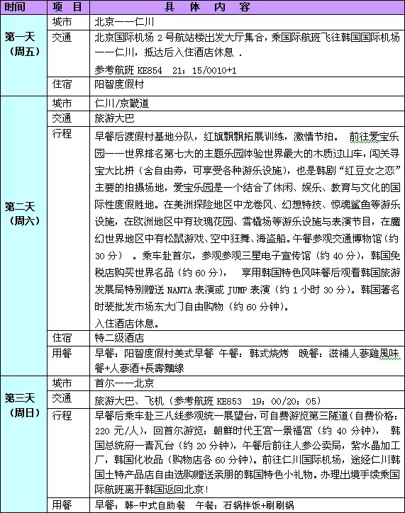 行程报价:2980元/人,凭华声在线王建五的博客优惠券(http://wangjianwu.blog.voc.com.cn)每人可优惠300元,售价仅为2680元/人。 费用包含以下内容:韩国全程特二级酒店以上标准或韩式渡假村/房间2人1间/1日3餐/全程华语导游;包含国际及境外交通费/全程机场税/第一景点门票/签证费/旅行社责任险;全程活动拓展组织费。