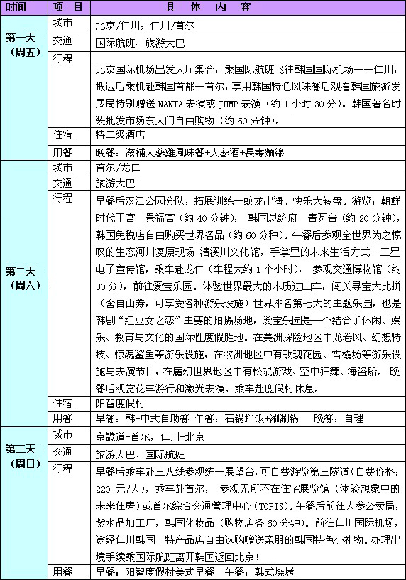 行程报价:2880元/人,凭华声在线王建五的博客优惠券:(http://wangjianwu.blog.voc.com.cn)每人可优惠300元,售价仅为2580元/人。 费用包含以下内容:韩国全程特二级酒店以上标准或韩式渡假村/房间2人1间/1日3餐/全程华语导游;包含国际及境外交通费/全程机场税/第一景点门票/签证费/旅行社责任险;全程活动拓展组织费。 不含护照费/国内交通费/个人消费/小费(30元/人天),自费项目和旅游意外伤害保险。