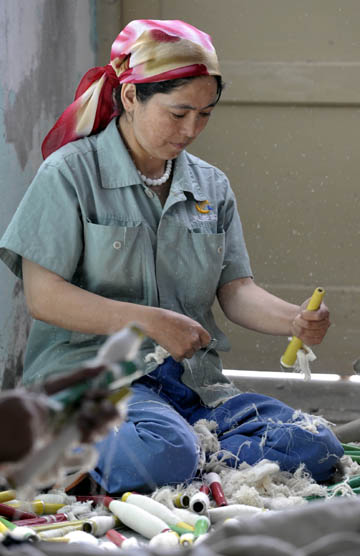 7月30日,新疆天盛实业有限公司的一位维吾尔族女工在车间工作。 位于新疆石河子国家级经济技术开发区的天盛实业有限公司因地制宜,利用靠近棉花产地的优势积极发展棉纺织业,现已形成年产50万锭的生产规模,同时从和田、喀什、吐鲁番等地大量招收少数民族员工,解决了他们的就业问题。目前公司有2200多名维吾尔族、回族、柯尔克孜族、蒙古族、哈萨克族等少数民族员工,占员工总数的2/3。