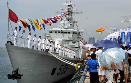 8月9日,观众在排队参观海军舰艇。