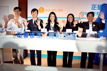 卫生部应急办张国新副主任、中国健康教育中心卫生部新闻宣传中心陶茂萱副主任、中国红十字会赈济部王平部长、舒肤佳品牌总监周涛、舒肤佳健康大使杨扬5人共同演示正确洗手方法。本报记者