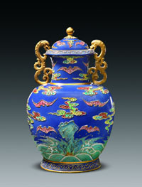珐琅粉彩寿山福海双龙耳盖瓶。 | 本报讯