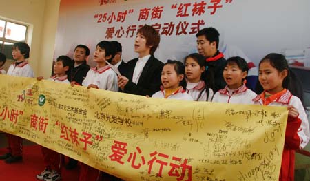 11月30日,由中国少年儿童文化艺术基金会携手“25小时”商街共同发起的“红袜子”爱心行动启动仪式在北京通州光爱学校举行。北京光爱学校是一所收养孤贫儿童的民间慈善机构,其建立旨在救助孤儿.帮助流浪儿童返乡入学,并对留守儿童、流动儿童中有逃学、厌学等倾向的孩子进行心理健康教育辅导。为了帮助学校师生落实今冬的取暖费,“25小时”商街与中国少年儿童文化艺术基金会在网上发起"红袜子"爱心活动,号召社会各界人士为"光爱学校"奉献爱心,帮助这105个孩子,让他们度过一个温暖的冬天。