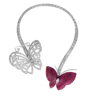 本次展览的主题为“美之魂”(THESPIRTOFBEAUTY),展览在东京的森美术馆内营造了一片森林深处的珠宝秘园。在那里,百年来梵克雅宝旗下的得意之作齐聚一堂,闪耀夺目却又不相互争艳。因为尽管时代变迁,但“美之魂”没有改变。百年前的美仍在今天赢得了人们的赞誉,诉说着传奇的故事。 展览共分“自然之师”“优雅之师”“搜奇之师”和“灵气之师”4个主题展区。从进入展区之时,便仿佛步入了一片神秘的森林。耳边传来鸟儿清脆叫声的背景音乐,蜿蜒的白色树枝躺在一旁,树枝上落满了“朝露”。而每一件精致的珠宝作品就被藏在透明的形似露珠的圆形玻璃罩内。“这个主题区的灯光最暗,想展示一种太阳还未升起时,森林深处生命活动的迹象。”梵克雅宝日本公司公关部负责人斋藤佳子告诉记者。 “自然之师”展区集中展示了体现大自然的珠宝作品,其中最耀眼的当属蝴蝶图案的首饰。双蝶项链是整个展览的第一件作品,也是斋藤最喜欢的一件。两只不同颜色的蝴蝶各落在项链的两边,似在诉说着相恋的故事。该作品共使用了重达35克拉的钻石。 而在不远处,还有几十只“蝴蝶”在翩翩起舞。在一个展示罩内,悬挂着几十只神态各异、栩栩如生的舞蝶胸针,仔细看才发现蝴蝶翅膀上都镶嵌有大自然图案。该作品运用了日本传统的漆绘工艺,将仙鹤、乌龟、花草等图案刻画在蝴蝶的翅膀上。真不知道,这些珍奇的彩蝶如果一齐在林中飞舞,将会是怎样的一幅夺目景象。