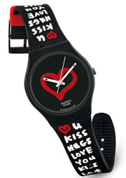 Swatch邀请来自纽约的画家、设计师马修·朗吉勒(MatthewLangille)以爱心凝聚欢快的风格演绎出浪漫宣言。马修以直白的红黑两色绘制出明快而勇敢的心。 时尚的黑色表盘托起涂鸦式红心,吸引了众人注意。表盘上未出现任何数字与刻度,优雅简约的指针见证了爱情的每一个甜蜜瞬间。黑色腕带上所绘制的红白相间信息,宛若只有爱人才能领悟的爱情密码。