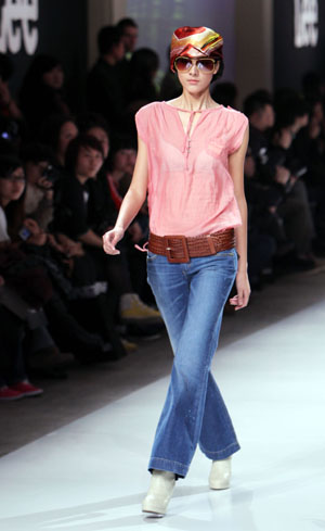Lee2010春夏新品发布日前在上海举行。该品牌春夏新品共分经典工装、西部主义、怀旧学院派及摇滚激情四个系列。图为模特在展示新品牛仔系列。