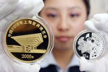 中国人民银行分别于2009年6月10日和2010年4月22日发行中国2010年上海世界博览会金银纪念币第1组一套和第2组一套。第一组纪念币共3枚,其中1/3盎司金币1枚,1盎司银币2枚;第二组纪念币共4枚,其中金币2枚,1盎司银币2枚,除了1/3盎司金币1枚外,另外1枚金币为5盎司,均为中华人民共和国法定货币。 |