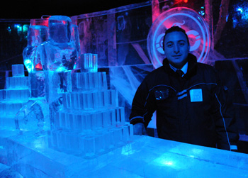这家冰雕博物馆用从瑞典运来的70吨冰雕成34种晶莹透体的景物,其中有北欧老人、手提篮子的妇人、北极熊、小鸟、驯鹿,还有船只、酒吧、小桥、会议室等。里面还用土耳其生产的100吨冰作为冰的围墙。 |
