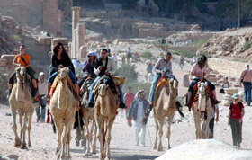 10月26日,在距约旦首都安曼约260公里的旅游名胜佩特拉,游人兴致勃勃地骑着骆驼游览。为让游客体验古罗马时期的风情,佩特拉景区为游客提供了马车、骆驼、毛驴等作为代步工具。