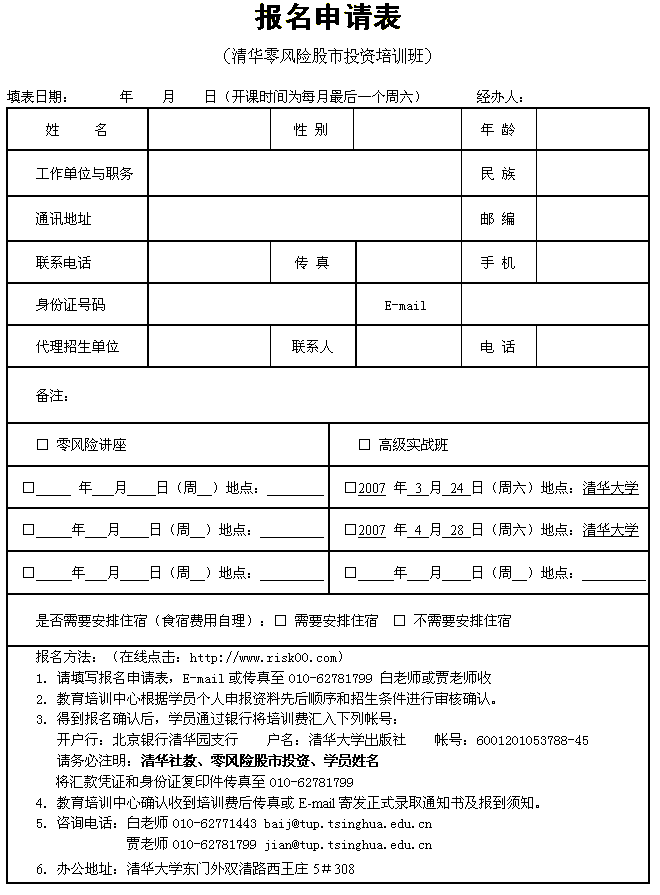 清华零风险股市投资培训班报名申请表