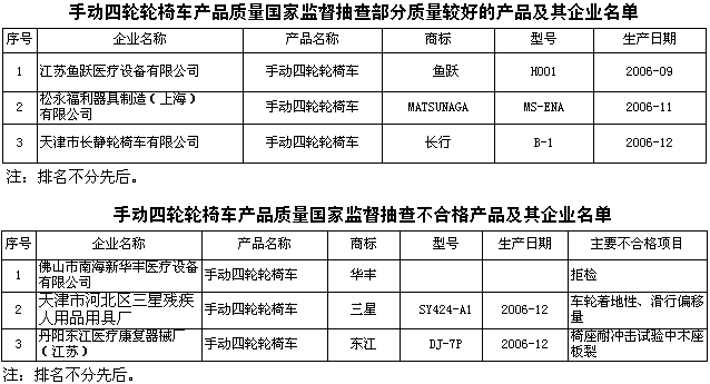 为维护广大消费者的合法权益,促进行业健康发展,国家质检总局组织对手动四轮轮椅车产品质量进行了国家监督抽查,共抽查了天津、河北、上海、江苏、广东、河南等6个省、直辖市22家企业生产的22种产品,产品抽样合格率为86.4%。