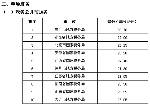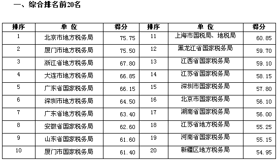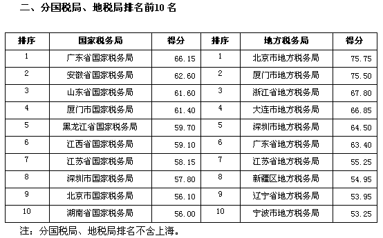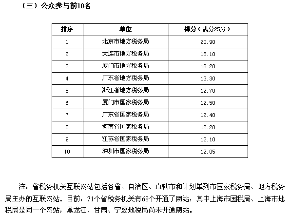 为加强税务机关互联网站建设,国家税务总局委托第三方评测机构(中国软件评测中心),按照《国家税务总局办公厅关于开展省税务机关互联网站评估的通知》(国税办函[2007]161号)的要求,分政务公开、在线办事、公众参与、网站管理4个部分设定指标体系,以网上采样的方式对各省、自治区、直辖市和计划单列市国家税务局、地方税务局主办的互联网站进行了客观评估,现将评估结果公布如下: