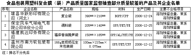 抽查中发现的主要质量问题是有部分产品溶剂残留总量和苯系溶剂残留量不合格。国家标准规定食品包装用塑料复合膜(袋)产品中溶剂残留总量≤10mg/m2,苯系溶剂残留量≤2mg/m2。溶剂残留总量和苯系溶剂残留量是反映成品包装膜、袋中残存的溶剂量。