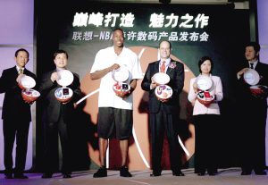 昨天(5日),NBA明星“魔兽”德怀特·霍华德(中)为联想全新NBA电脑外设产品发布助威。