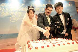 图为土耳其驻华大使馆文化参赞欧盛瑞(中)在发布会现场与一对新人共切婚礼蛋糕,启动土耳其蜜月游。