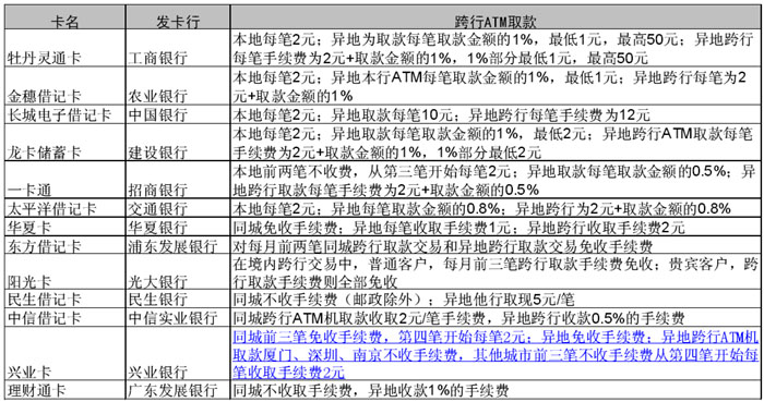 2500元,只要花4次取款,而异地跨行ATM机取款每笔手续费为12元,那么手续费为12×4=48元,节省了22元。 5月央行提高ATM机日提款上限到2万元本来是为减少排队、方便取款,持卡人在实际操作中却发现,如果是本地跨行取款2万元要付出20元的手续费。其实不同的银行,ATM机取款额度有所不同。用银行卡在ATM机上取款时,无论哪家银行当日累计的取款金额是5000元还是2万元,但每次单笔最多能取的额度也是不一样的。 在北京工作的李女士是建行龙卡借记卡的持卡人。李女士在中国银行的ATM机上取款时却发现,每次最多只能取2000元,取满2万元不仅需要反复操作10次,还要付出高达20元的手续费。李女士认为,银行应将单笔提款的额度提高,这样可以少取几次,总的手续费就可以降下来。李女士的看法代表了相当一部分持卡人的声音。 但目前跨行取款大多数银行都是要收取手续费的,取款人要想省下跨行的手续费,只能选择每笔较高额度的ATM机,减少跨行的手续费用。特别是当需要一次取出大量现金,又有不同银行的两至三个ATM机可以选择时,应该遵循以下两个原则:一、要选发卡行的ATM机;二、如果没有发卡行的ATM机,要选择单笔取款金额比较多的银行。 一般银行都没有对跨行取款的单笔限额单独设限。本行的ATM机对本行卡与他行卡一视同仁,但当他行卡的单笔取现额度低于本行卡时,以他行卡的限额为准。以工商银行为例,其ATM取款机单笔取现的最高额度是3000元。但建设银行的银行卡单笔取现额度是2000元,当它在工商银行ATM取款机上取款时,每次最多只能取2000元。 此外,如果手中持有的银行卡是浦发银行、光大银行、民生银行和华夏银行等银行发售的,跨行取款有一定的优惠,它们有的同城跨行不收取手续费或者异地跨行取款有2至3次的免手续费机会,相对于其他银行卡在ATM机取款,可节约一定的手续费。(见下表)