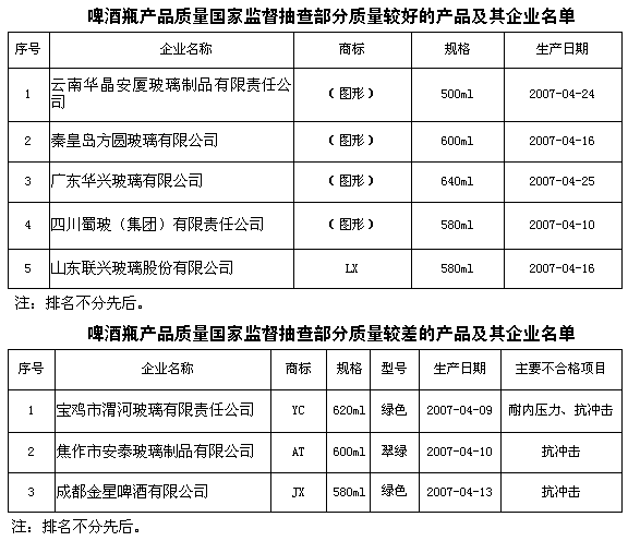为维护广大消费者的合法权益,促进啤酒瓶行业健康发展,国家质检总局组织对啤酒瓶产品质量进行了国家监督抽查。共抽查了河北、山西、吉林、黑龙江、上海、江苏、浙江、安徽、福建、山东、河南、湖北、湖南、广东、四川、重庆、云南、陕西、甘肃、宁夏、新疆等21个省、自治区、直辖市65家企业生产的65种产品(不涉及出口),产品抽样合格率为86.2%。 此次抽查依据GB4544-1996《啤酒瓶》等国家标准进行检验,主要包括理化指标和标志指标。涉及的主要理化指标为:内应力、抗冲击、耐内压力和垂直轴偏差。标志指标主要是为防止不耐压的非啤酒专用瓶用来灌装啤酒,国家标准规定在瓶底以上20mm范围打有啤酒瓶专用标记“B”和生产企业的标记,生产的年、季。经检验,标志指标项目全部合格,部分产品理化指标中的抗冲击和耐内压力不合格。 抽查结果表明,一是连续的国家监督抽查促进了企业质量意识的提高,加强了质量管理,使啤酒瓶产品质量水平比上次抽样合格率提高了13.6个百分点;二是市场占有率较高的大中型企业产品质量较好,具有先进的生产工艺和严格的质量管理;三是部分小型生产企业的产品质量问题较多。 抽查中发现的主要质量问题: 1、部分啤酒瓶抗冲击力能力达不到国家标准规定的要求,抗冲击力能力差的啤酒瓶在罐装啤酒后,受到某种外力作用时,可能会发生啤酒瓶爆炸。 2、部分啤酒瓶耐内压力达不到国家标准规定的要求。耐内压力差的啤酒瓶在盛装啤酒后,在生产、运输和使用过程中,会因轻微碰撞而引起爆炸,也有可能发生自爆。
