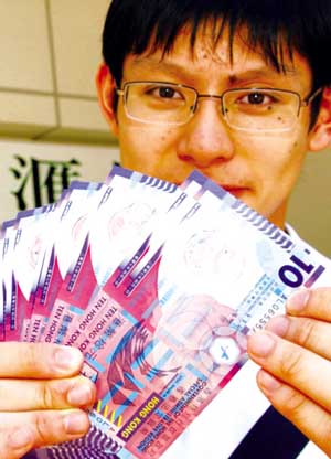 香港首批10港元面额的塑质钞票9日面世,发行量为5000万张。这款新钞比旧钞更耐用、更易保持干净,而且符合环保要求。 图为香港市民在汇丰银行前,展示刚兑换的新10元塑质钞票。