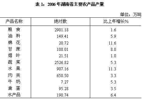 农业生产稳定增长。2006年,全省粮食播种面积5295.42千公顷,增长1.5%,其中稻谷播种面积4202.22千公顷,增长1.1%。油料种植面积920.23千公顷,增长2.7%。棉花种植面积135.61千公顷,增长1.9%。蔬菜种植面积1048.91千公顷,增长5.2%。粮食总产量2901.18万吨,增长1.6%,其中稻谷产量2514.81万吨,增长1.2%。全年出栏肉猪7700.57万头,增长2.7%;出笼家禽60447.05万羽,增长5.5%;水产品产量190.74万吨,增长6.4%。