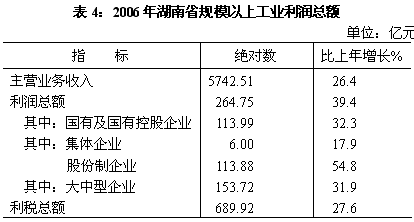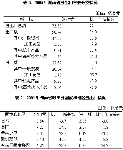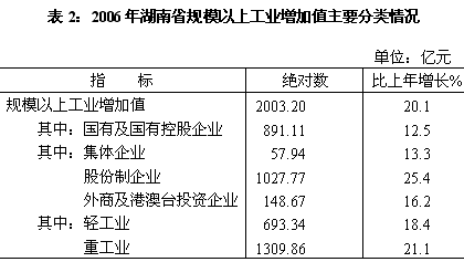 经济平稳较快发展。2006年,全省生产总值为7493.17亿元,增长12.1%,比上年快0.5个百分点。其中第一产业增加值1331.31亿元,增长4.8%;第二产业增加值3123.46亿元,增长15.5%;第三产业增加值3038.4亿元,增长12.4%。按常住人口计算,人均生产总值为11830元,增长10.5%。全省生产总值一季度、上半年和前三季度分别增长12%、12.2%和12%,连续12个季度保持了11%以上的增长,且波动幅度较小。企业效益提高,全省规模以上工业企业盈亏相抵实现利润264.75亿元,增长39.4%。财政收入增长较快。据快报统计,全省财政总收入891.16亿元,增长19.3%,其中地方财政收入475.3亿元,增长20.3%。 经济结构继续改善。2006年,在全省生产总值中,三次产业结构由上年的19.6∶39.9∶40.5调整为17.8∶41.7∶40.5,其中第二产业增加值占全省生产总值的比重提高1.8个百分点。重点监控行业投资得到有效控制,全省城镇以上钢铁、汽车、电解铝投资分别下降8.5%、7.3%和62.7%;基础设施和基础产业投资得到加强,全省交通投资289.96亿元,增长63.5%,比上年快41个百分点;高新技术产业投资比上年快29.4个百分点。新型工业化稳步推进。全省工业增加值占全省生产总值的比重比上年提高2个百分点;规模以上工业增加值占全部工业增加值的比重提高0.7个百分点;高新技术产业增加值占全省生产总值的比重提高0.7个百分点;园区工业增加值增长速度比规模以上工业快5.9个百分点。全省城镇化率为38.7%,比上年提高1.7个百分点。全省非公有制经济增加值4034.75亿元,占全省生产总值的比重达53.8%,比上年提高3.6个百分点。非国有经济投资2036.9亿元,增长30.3%;占全社会固定资产投资的比重达62.8%,比上年提高1.8个百分点。 区域经济协调发展。优势地区继续发挥带动作用,长株潭三市生产总值达2818亿元,增长14.1%,比全省快2个百分点;“一点一线”地区生产总值为4770.15亿元,增长12.9%。大湘西地区开发稳步推进,生产总值为814.24亿元,增长11.6%。“3+5”地区生产总值为5644.98亿元,增长13.2%。 市场物价基本稳定。全省居民消费价格总水平上涨1.4%,商品零售价格上涨1.3%,农产品生产者价格上涨0.7%,农业生产资料价格上涨0.7%,工业品出厂价格上涨4.3%,原材料、燃料、动力购进价格上涨6.5%,固定资产投资价格上涨3.1%。 和谐社会建设稳步推进。全省8件实事23个考核项目全面完成目标任务,其中18个考核项目超额完成任务。全年城镇新增就业62.56万人,下岗失业人员再就业34.57万人。企业基本养老保险新增参保人数53万人;基本医疗保险新增参保人数54.84万人;工伤保险新增参保人数53.91万人。新建城镇经济适用房117.1万平方米。建设城镇最低收入家庭廉租住房14.7万平方米。扩改建乡镇敬老院321所,集中入住五保对象1.23万人。年末有98个县(市、区)建立了农村最低生活保障制度。全年发放救灾救济款5.59亿元(包括现金和实物折价)。受灾群众的生产生活得到妥善安置。建设农村中小学寄宿制学校434所,农村教育“两免一补”政策全面落实。新建和改扩建农村乡镇卫生院611所。全年农村外出务工人员达1455.71万人(含在本乡镇内),劳务总收入761.31亿元,增长14.2%。 经济社会发展中存在的主要问题是:经济增长方式仍较粗放,产业升级难度大;节能降耗、污染减排压力大;农村和农业基础依然薄弱,农民持续增收后劲不足等。