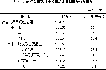 消费市场持续升温。2006年,全省社会消费品零售总额2834.22亿元,增长15.3%,扣除物价因素,实际增长13.8%,增幅创改革开放以来的新高。分地域看,城市消费品零售额1630.35亿元,县及县以下零售额1203.87亿元,分别增长16.5%和13.6%。分行业看,批发零售贸易业零售额2386.58亿元,增长15.3%;住宿餐饮业404.34亿元,增长15.7%;其他行业43.29亿元,增长9.1%。 零售额集中度提高。全省限额以上贸易企业零售额557.18亿元,增长28.4%,占贸易业的比重为23.3%,比上年提高2.2个百分点。大型商品交易市场快速发展,全省亿元以上商品交易市场194个,增加60个;商品总成交额1032亿元,增长20.6%。 消费品零售结构升级加快。全省限额以上贸易企业通讯器材类零售额增长39.3%;体育娱乐用品类零售额增长25.4%;文化办公用品类零售额增长49.5%。汽车零售量79797辆,增长52.6%;零售额89.86亿元,增长74.9%。其中轿车零售量64788辆,增长58.3%;零售额76.94亿元,增长82.5%。液晶电视机零售量24357台,增长7倍;零售额2.01亿元,增长8.76倍。