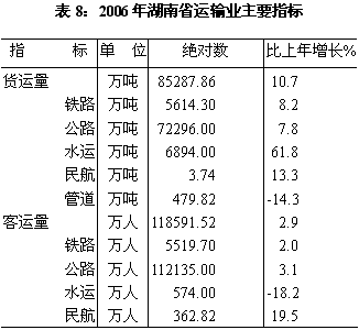 交通运输业稳步发展。2006年,全省全社会货物周转量1776.05亿吨公里,增长7.5%;旅客周转量1074.15亿人公里,增长7.2%。机场旅客吞吐量723.24万人,增长19.8%;其中黄花机场旅客吞吐量559.71万人,增长26.7%。