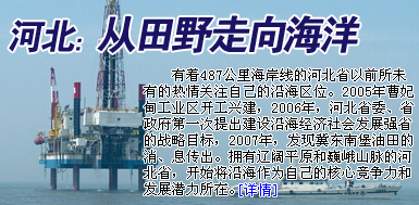 | 今年初,河北省政府批准设立沧州渤海新区,决定从产业发展、基础设施、财政税收以及土地、海域使用等多方面给予大力支持,力争使沧州成为继唐山曹妃甸工业区之后全省第二大经济增长极和实施"东出西联"战略的桥头堡。[详情] | |