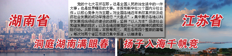 党的十六大以来,湖南省经济社会呈现出"又好又快"的蓬勃发展态势。湖南省统计局局长刘国湘在接受本报记者专访时认为,巨变来自于十六大以后湖南两次发展思路转变。 第一次转变是湖南省第八次党代会上提出的,是湖南第一次思路转型。变化的核心是由习惯于抓农业向加快推进工业化、农业产业化和城镇化的"三化"进程转变。[详情] | |