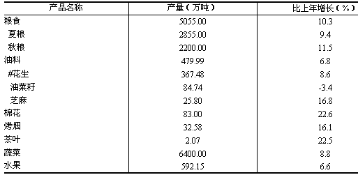 全年全省粮食种植面积13954.62万亩,比上年增加224.50万亩;其中,小麦种植面积7510.01万亩,增加66.00万亩,优质专用小麦种植面积占小麦种植面积的比重为61.4%。棉花种植面积1200.92万亩,增加28.71万亩。油料种植面积2326.50万亩,减少82.25万亩。蔬菜种植面积2597.70万亩,增加203.92万亩。 全年全省粮食产量5055.00万吨,比上年增产10.3%;棉花产量83.00万吨,增产22.6%;油料产量479.99万吨,增产6.8%。全年肉类总产量737.00万吨,增长7.0%;禽蛋产量400.82万吨,增长6.8%;牛奶产量147.68万吨,增长42.0%。全年水产品产量60.10万吨,增长16.3%。