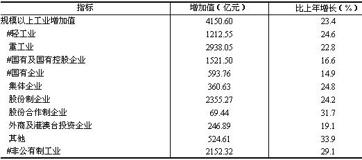 全年全部工业增加值6070.93亿元,比上年增长18.7%,工业对经济增长的贡献率为61.1%。其中,规模以上工业增加值4150.60亿元,增长23.4%;产品销售率98.5%,比上年提高0.1个百分点。