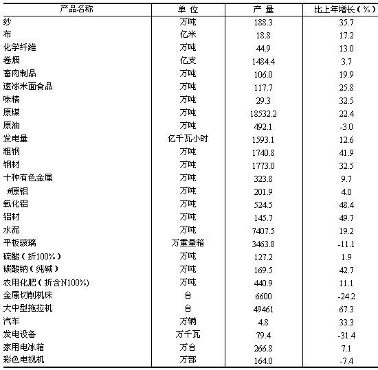 全省规模以上工业中,煤炭开采和洗选业实现增加值380.71亿元,比上年增长20.6%;农副食品加工业增加值270.72亿元,增长25.1%;纺织业增加值147.31亿元,增长21.3%;化学原料及化学制品制造业增加值230.08亿元,增长26.8%;非金属矿物制品业增加值391.45亿元,增长26.9%;黑色金属冶炼及压延加工业增加值242.08亿元,增长24.7%;有色金属冶炼及压延加工业增加值298.88亿元,增长18.2%;通用设备制造业增加值150.78亿元,增长27.9%;专用设备制造业增加值132.27亿元,增长23.0%;电力、热力的生产和供应业增加值368.11亿元,增长21.4%。 主要工业产品产量中,畜肉制品产量比上年增长19.9%,速冻米面食品增长25.8%,原煤增长22.4%,发电量增长12.6%,钢材增长32.5%,铝材增长49.7%,大中型拖拉机增长67.3%。