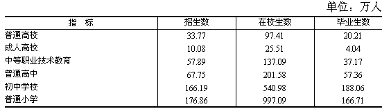 全年全省普通高等学校招生33.77万人,在校生97.41万人,毕业生20.21万人。普通高中招生67.75万人,在校生201.58万人,毕业生57.36万人。初中学校招生166.19万人,在校生540.98万人,毕业生188.06万人。普通小学招生176.86万人,在校生997.09万人,毕业生166.71万人。