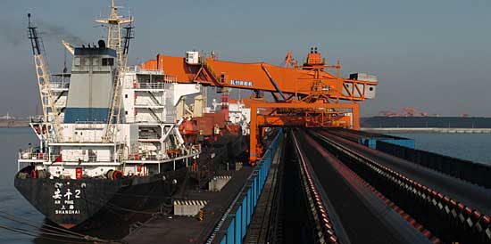 一艘轮船停泊在秦皇岛港煤码头装货。本报记者 杨世尧