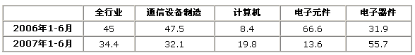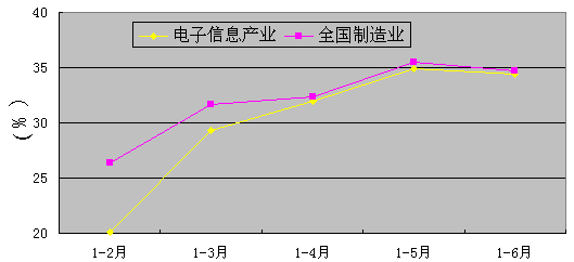 图1 2007年1-6月电子信息产业与全国制造业累计完成投资增速对比情况(%)