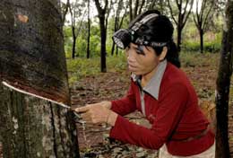 红星新村农民符丽芬在割胶。 本报记者:姜恩宇