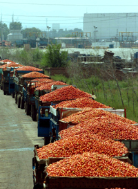 成批的优质西红柿运进工厂加工番茄酱。 本报记者:赵戈