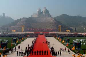 | 4月18日,106米高的炎黄二帝巨型塑像在郑州黄河风景区落成。摄影/本报记者 赵鹏 |