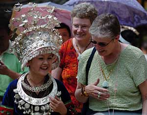 | 两名外国旅游者在凯里市南花村同当地苗族妇女交流。摄影/杨俊江 | “最具吸引力的旅游胜地”