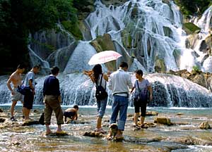 游客在平塘县甲茶瀑布旅游。摄影/杨俊江 |