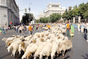 9月9日,一些牧民赶着绵羊在西班牙首都马德里穿城而过。当天,来自西班牙各地的牧民赶着羊群在马德里举行一年一度的穿城游行,目的是引起政府对牧业的重视,要求古老的游牧路线得到保护。