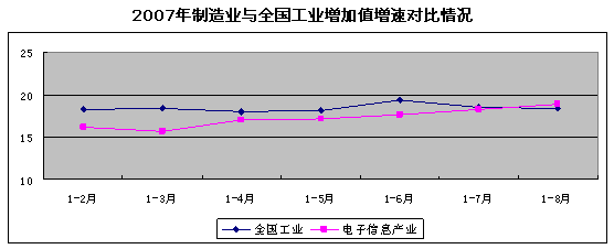今年1-8月我国电子信息全行业继续保持平稳发展,总量增速小幅上升,规模以上制造业经济效益稳步回升。1-8月全行业实现主营业务收入29929.2亿元,同比增长19.4%,其中制造业实现主营业务收入26490.3亿元,同比增长19.0%;软件业实现收入3438.9亿元,同比增长22.9%。制造业实现工业增加值5794.0亿元,同比增长18.9%;实现利润922.1亿元,同比增长25.6%;实现税金307.2亿元,同比增长18.5%。