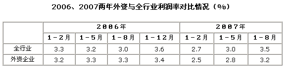 1.外资企业利润率低于全行业平均水平。1-8月外资企业实现659.5亿元,同比增长15%,低于全行业平均增速10.6个百分点,占全行业比重71.5%,比1-5月的75.3%下降3.8个百分点。自去年年底以来外资企业利润率开始低于全行业利润率水平,从今年2月、5月、8月数据看,这种局面不但没有得到改善,反而有逐步扩大的趋势。