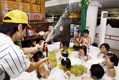 啤酒温泉浴近来风靡日本。在某些体育项目比赛中,胜利者通常在赛后以喷洒啤酒的方式庆祝胜利,啤酒温泉浴的创意就来源于此。图为在日本神奈川县箱根町的温泉胜地,人们享受啤酒温泉浴。