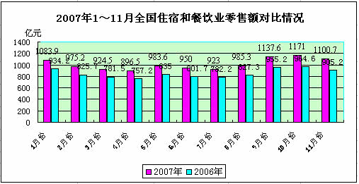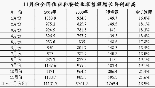 今年11月份,全国住宿与餐饮业零售额实现1100.7亿元,比去年同期增长21.6%,增幅高出3.9个百分点,比上月增幅高出0.2个百分点,再创今年新高。今年1-11月份,全国住宿与餐饮业零售额累计实现11131.3亿元,同比增长18.9%,比去年同期增幅高出2.7个百分点,占社会消费品零售总额的13.9%,拉动社会消费品零售总额增长2.6个百分点,对社会消费品零售总额的增长贡献率为15.7%。 1-11月份,住宿与餐饮业新设立外商投资企业862家,同比下降11.9%;合同外资金额32.6亿美元,同比增长29.6%;实际使用外资金额7.9亿美元,同比增长8.3%。 从限额分类看,1-11月份,限额以上住宿与餐饮企业零售额3294.1亿元,同比增长18.8%,占全国住宿与餐饮业零售额的29.6%。限额以下住宿与餐饮企业零售额7837.2亿元,同比增长18.9%,占全国住宿与餐饮业零售额的70.4%。